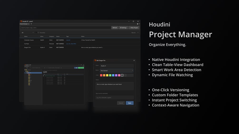 Houdini Project Manager is a native workflow tool designed to streamline project organization directly within SideFX Houdini.